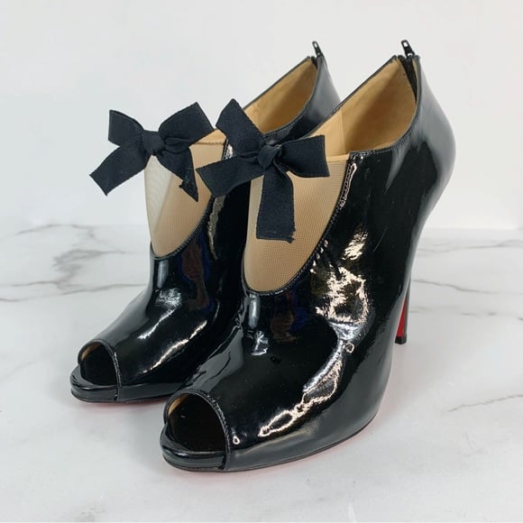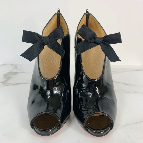 Lovely Christian Louboutin Estandono Black Patent Leather Bow Ankle Peep Toe Bootie