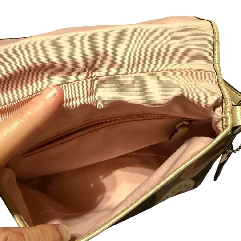 This Coach crossbody bag features a chic and fashionable design with a signature circle print in pink, brown, and beige. Made from fabric, it includes an adjustable strap and multiple pockets for convenience. The bag measures 8 inches in width, 6 inches in height, and 4 inches in depth. It has a beige fabric lining and a buckle closure. Crafted in Vietnam, this small-sized bag is perfect for casual occasions. The condition is pre-owned.