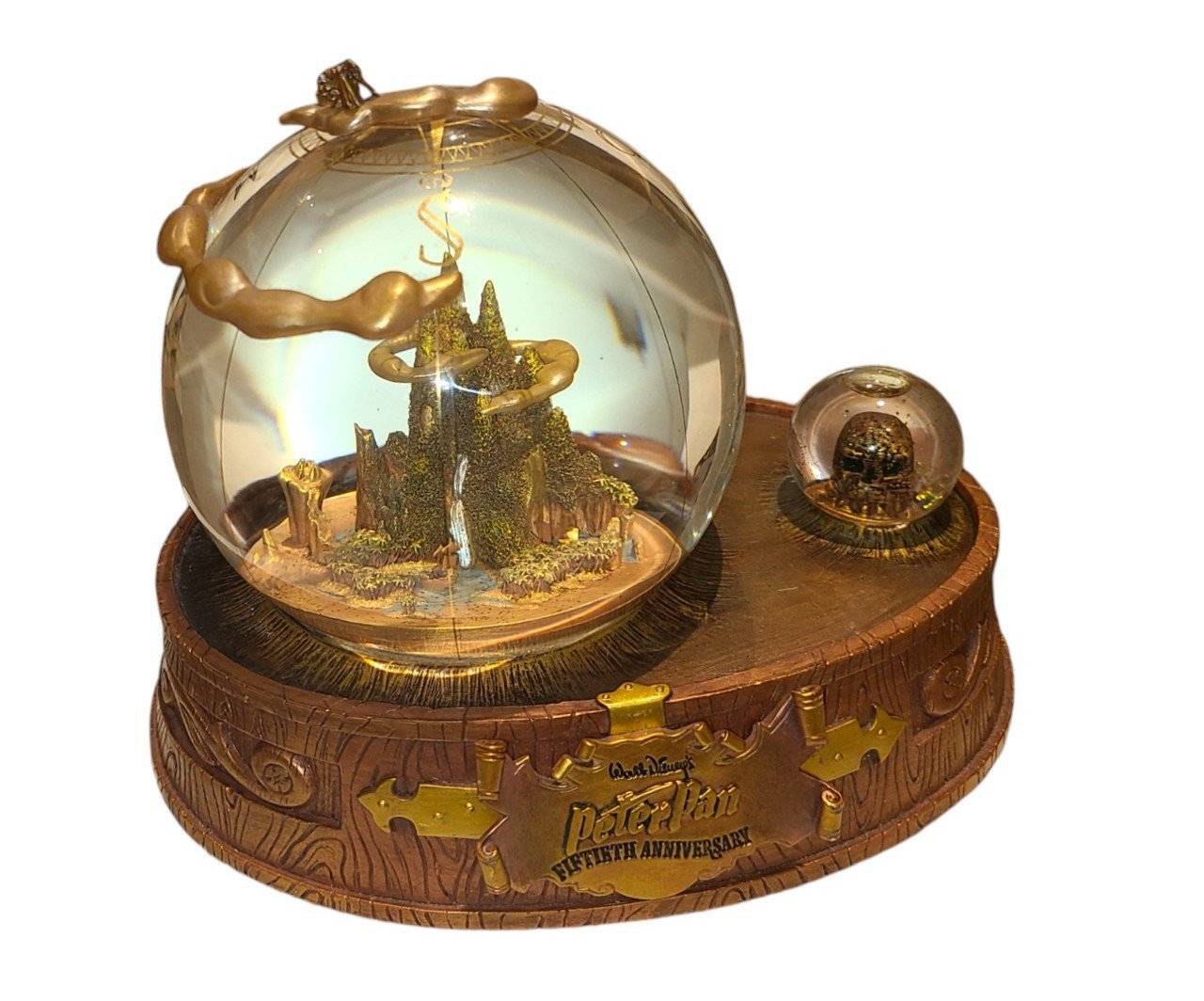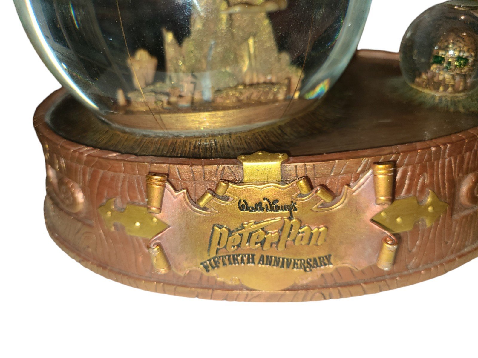 Disney Peter Pan Neverland 50th Anniversary Musical Snowglobe Snow Globe. The skull lights up as shown in the last 2 pictures (batteries not included). Plays "You Can Fly". In overall good condition however 3 heads are missing (super common with this globe). May be a tad dusty from sitting on a shelf but that's about it. Please review all photos for a better idea of condition. Rare and hard to find, exclusive limited edition.