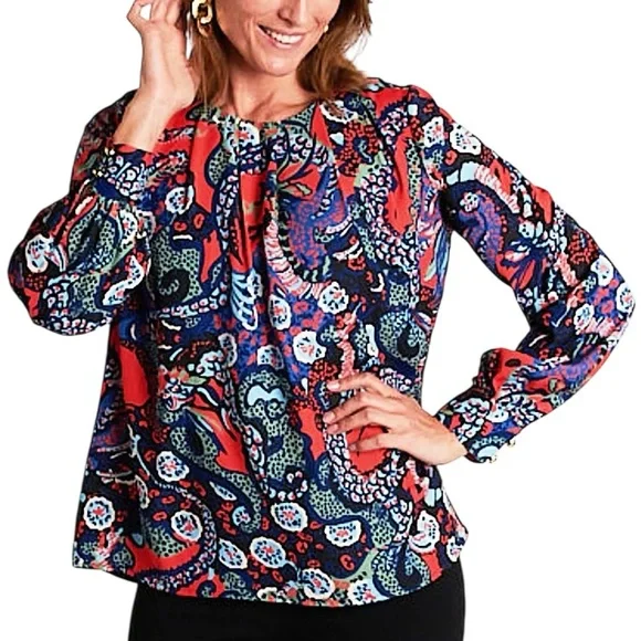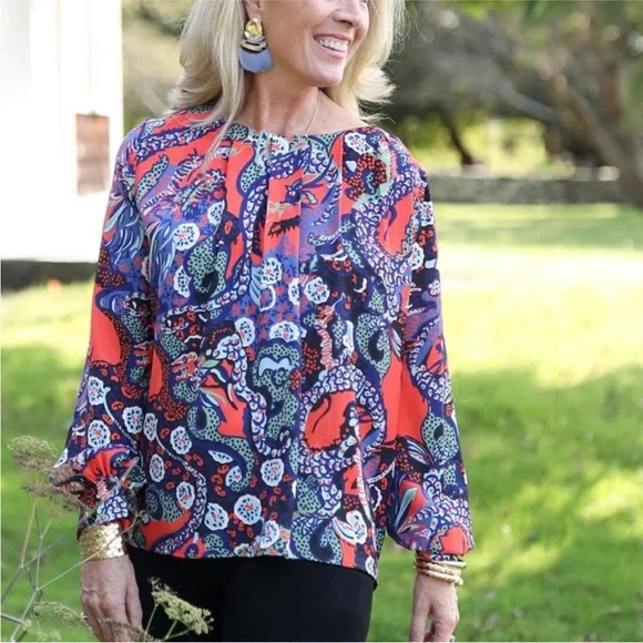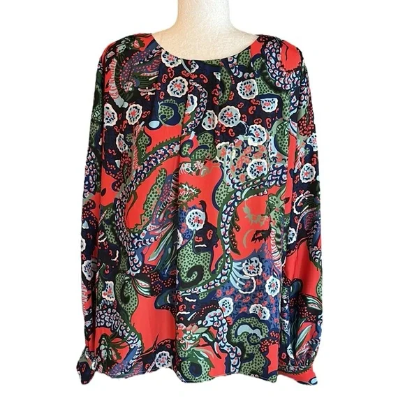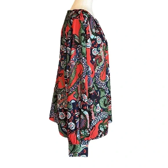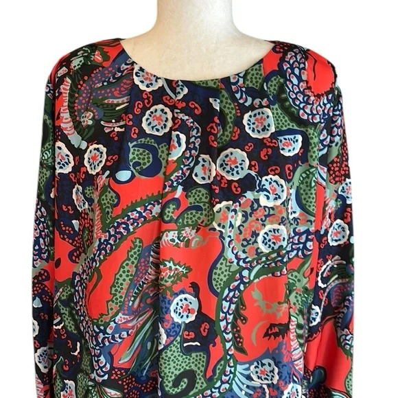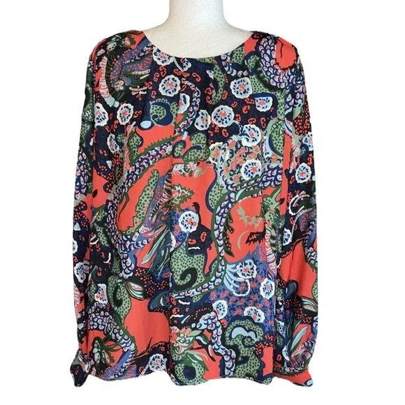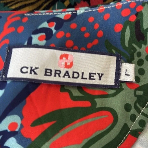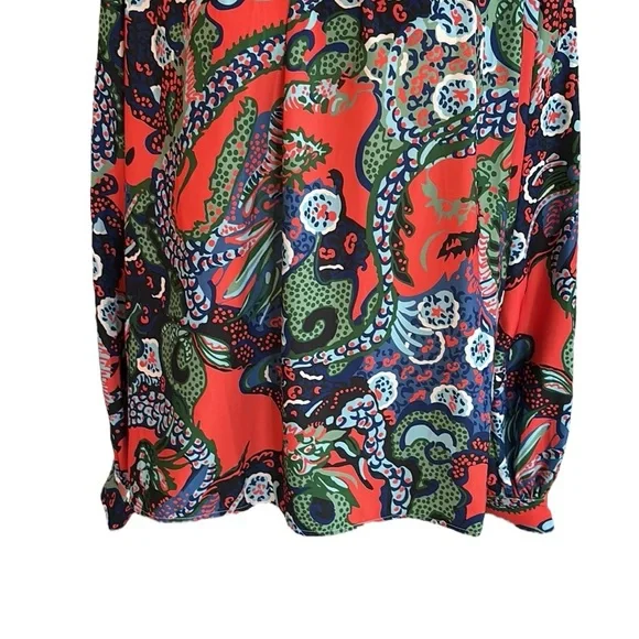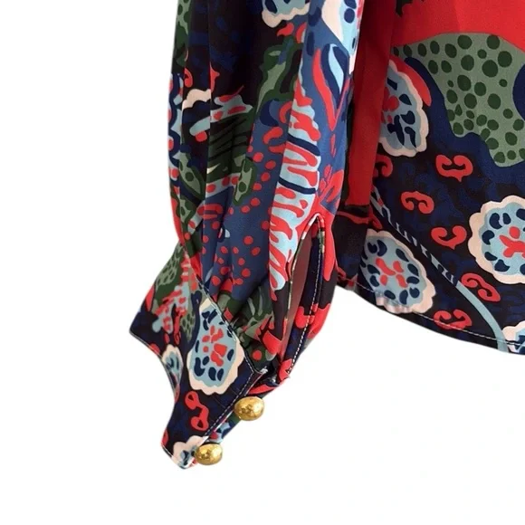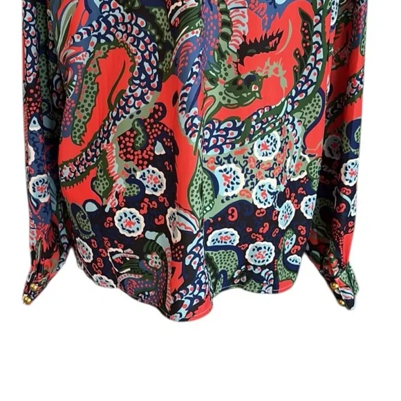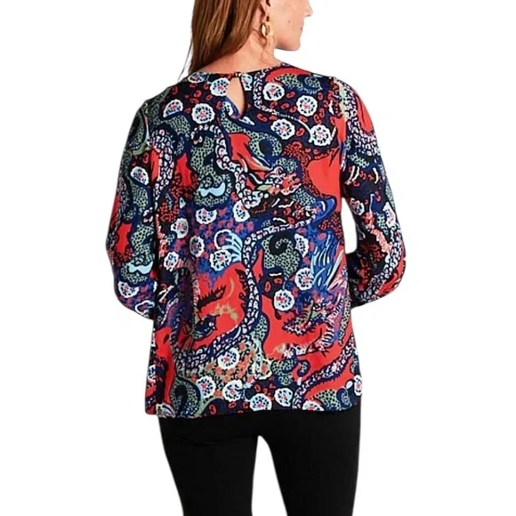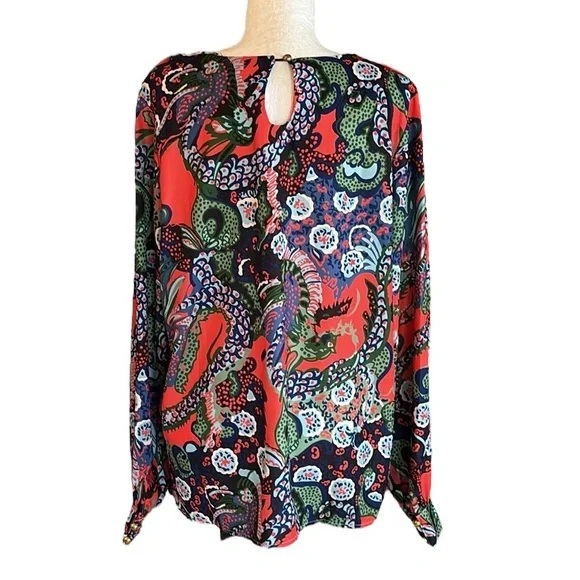 Like New!Gorgeous CK Bradley Cheshire Blouse in Dragon Black Red, green, blue, black, and white dragon chinoiserie floral printPleated front Long ballon sleeves with gold buttons on the cuffsBack button with a keyhole cutout opening Pullover styling 100% silky poly In like new hardly worn condition Size Large Bust pit to pit - 24”Length - 27”