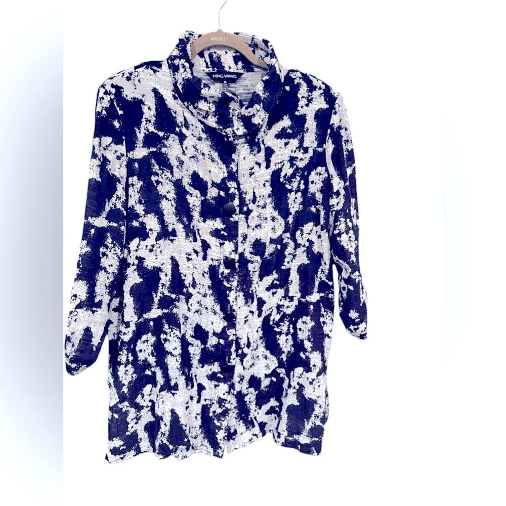 Pre owned Ming Wang Navy Blue and White Button Up Blouse size XL in great condition. 100% cotton, very soft linen fabric. This can easily be an Oversized blouse or a cute linen jacket. There is metal boning in the collar to move it up or down or simply mold the collar how youd like. Sleeves have roll tabs, this makes the sleeves quarter sleeves.