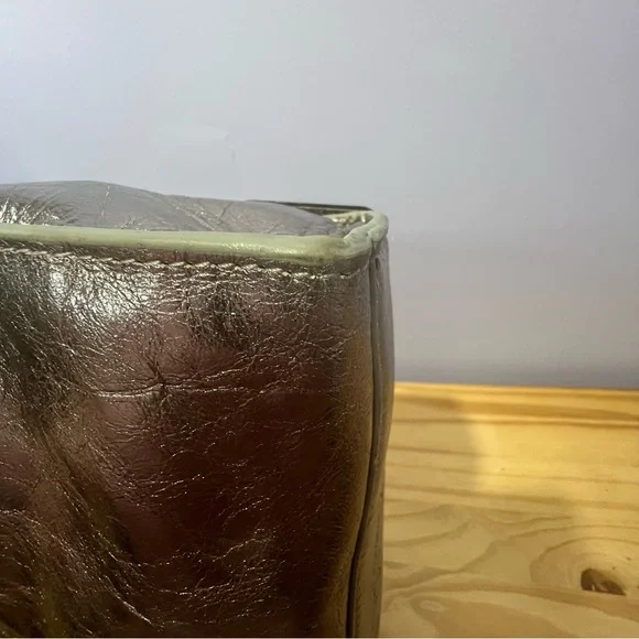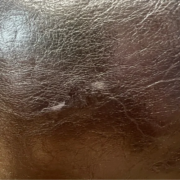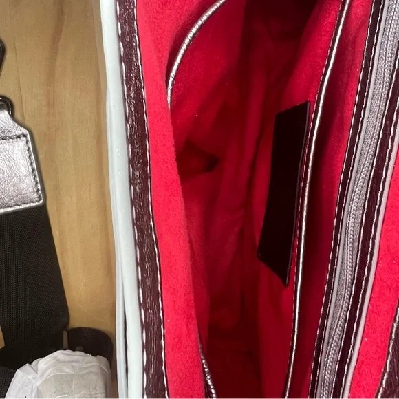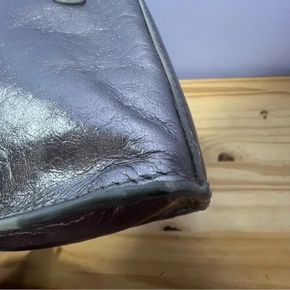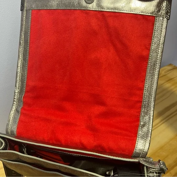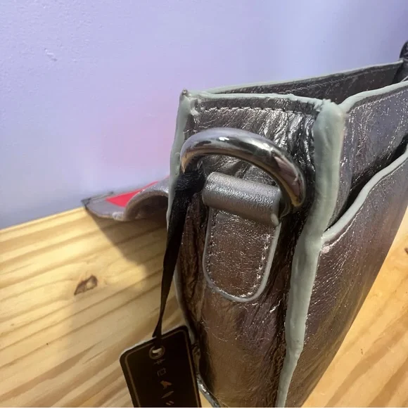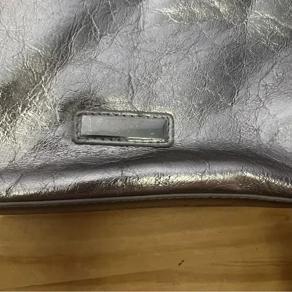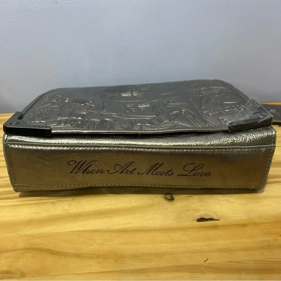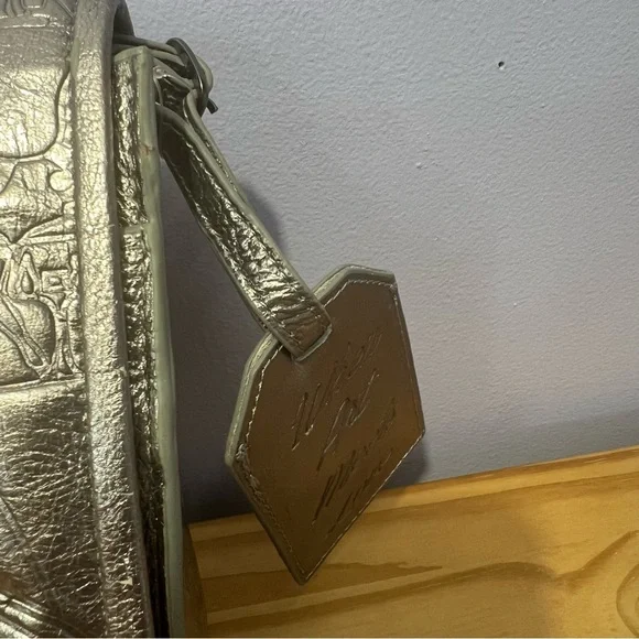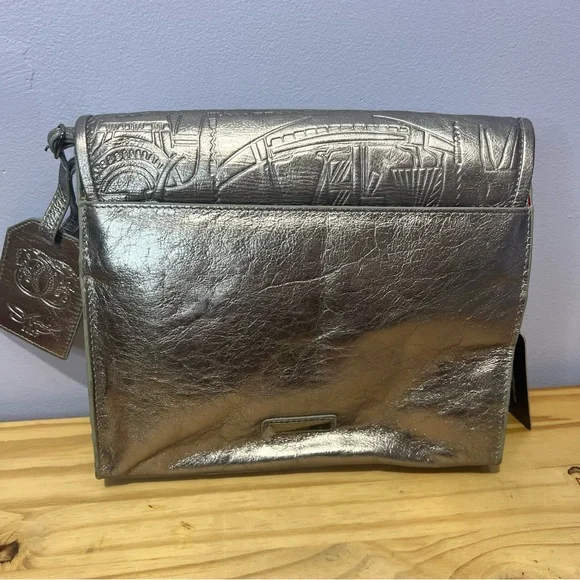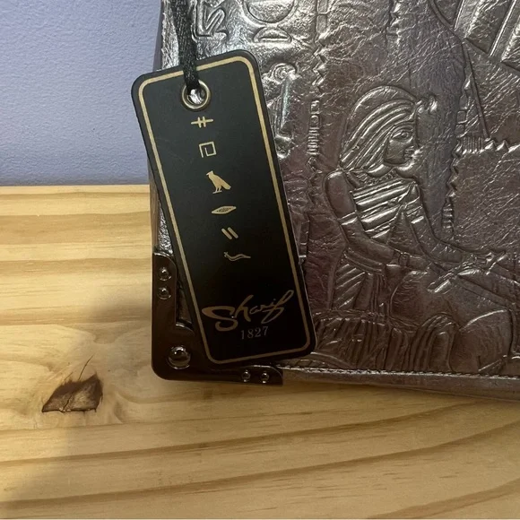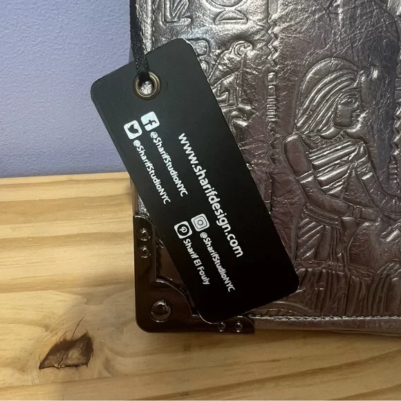 NWT Sharif Silver Leather Hieroglyphics Bag 10.25"x8.75"x3" Adjustable and removable strap callouts: there is some wear and markings on bag - most notably on the trim. Some hardware still has the plastuc trim. Measurements, if noted, are approximate. My home is pet friendly. Each item is inspected before listing and again before shipping but stray hair is possible.