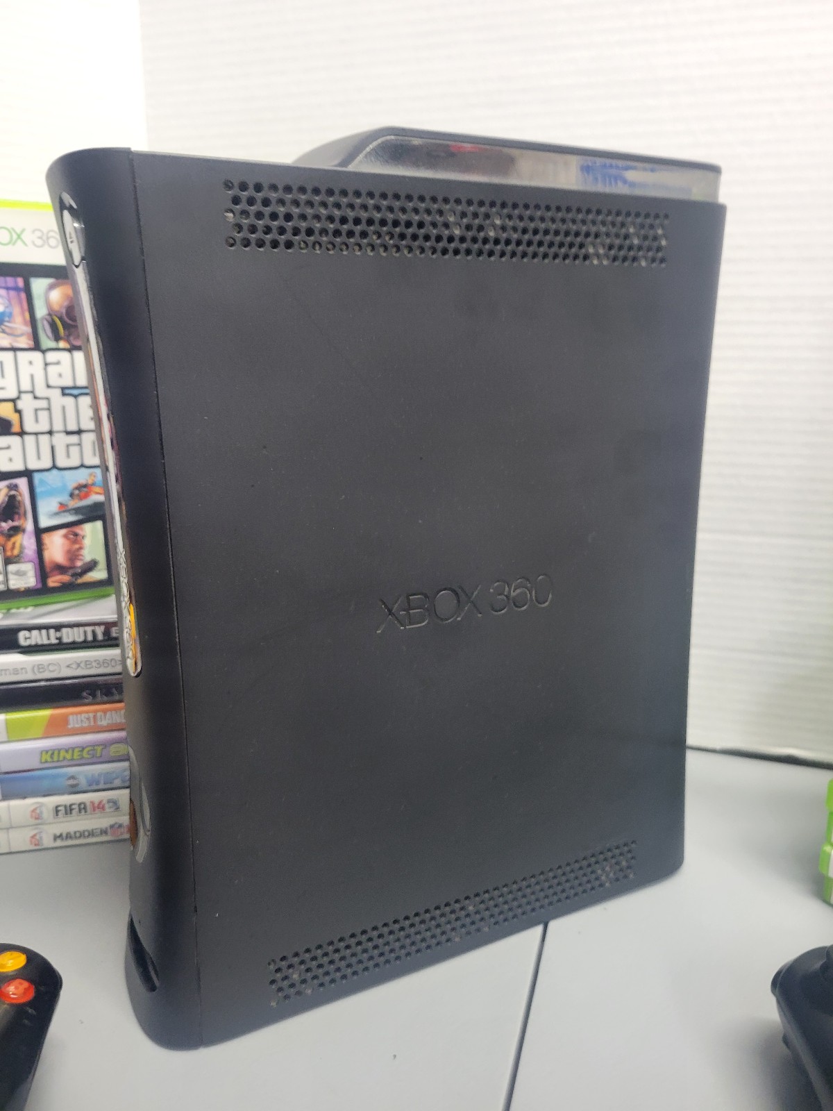 Xbox 360 bundle. Tested cleaned and working. 120gb. Comes with all wires needed. Comes with controllers 2 oem and 1 wired. 20 games. All used and show normal wear of minimal scuffs. Usb flap doesn't close. No affect. Also additional accessories, batteries life are unknown. Not sold separately.